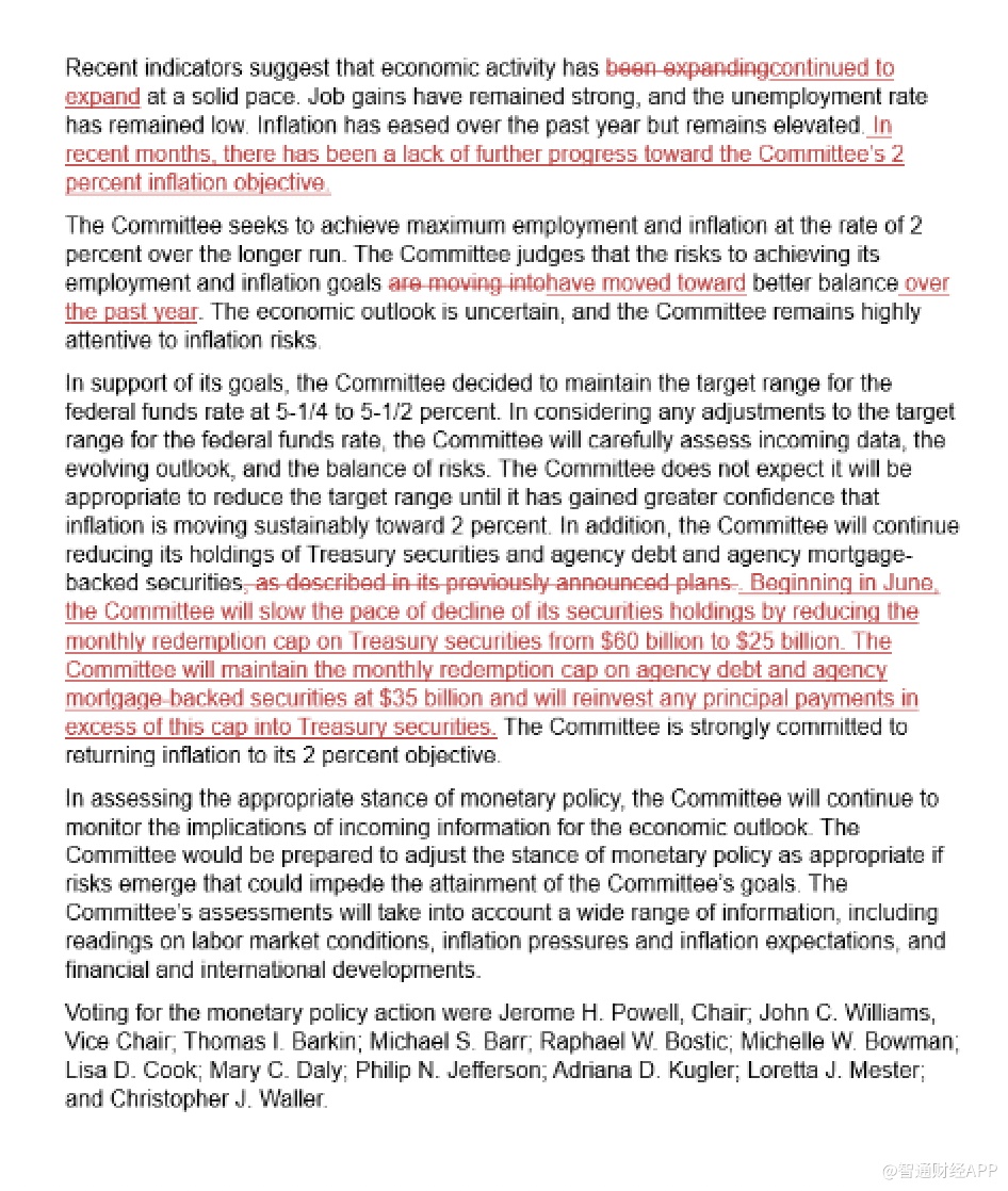 以下是周三联邦公开市场委员会声明与美联储3月份上一次政策制定会议后发布的声明的比较。文中删除的部分中间有一条横线,红色字体为增加或修改内容。