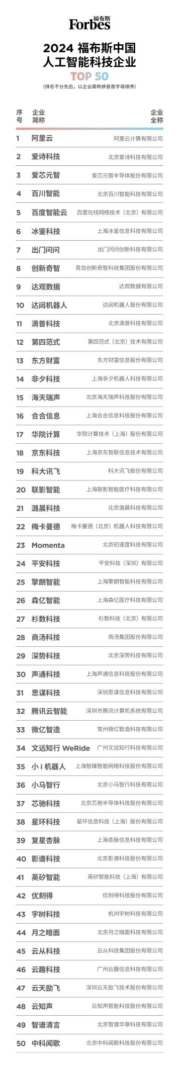 以下为“2024福布斯中国人工智能科技企业TOP 50”评选结果: