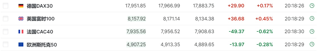 2. 截至发稿,德国DAX指数涨0.17%,英国富时100指数涨0.45%,法国CAC40指数跌0.62%,欧洲斯托克50指数跌0.28%。