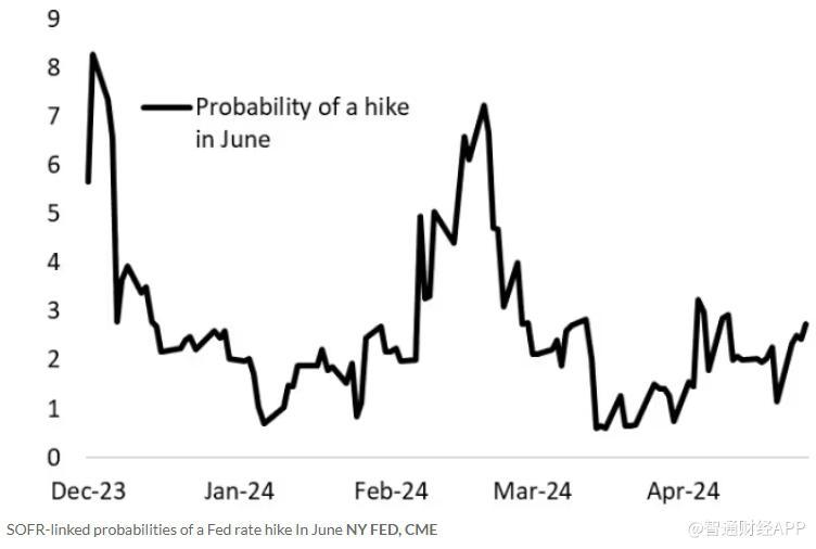 根据纽约NewEdge Wealth的高级投资组合经理及固定收益主管Ben Emons的说法,截至周四,与隔夜担保融资率(SOFR)相关的期权显示,9月或12月加息的可能性分别约为18%和超过20%。Emons还指出,期权交易者认为6月加息的可能性为3.1%。