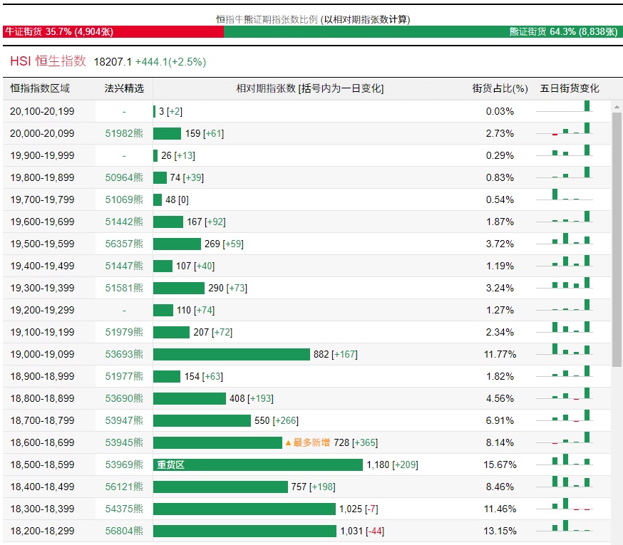法兴恒指牛熊证街货分布图中的数据显示,熊证街货最多新增在18600-18699区间,该区间最新熊证数量为728张,较上一交易日增加365张。重货区在18500-18599区间,该区间最新熊证数量为1180张,较上一交易日增加209张。