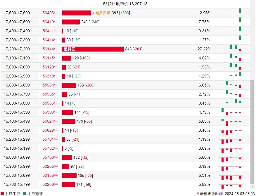 牛证街货最多新增在17600-17699区间,该区间最新熊证数量为393张,较上一交易日增加393张。重货区在17200-17299区间,该区间最新熊证数量为845张,较上一交易日减少201张。