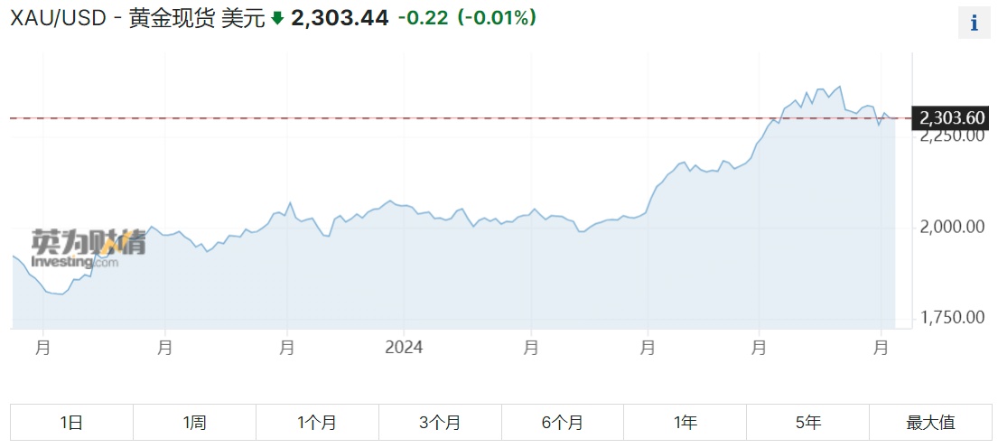 截至发稿,现货黄金每盎司2303.44美元。彭博美元现货指数在周四下跌0.7%后小幅走低。银、铂和钯价格走强。