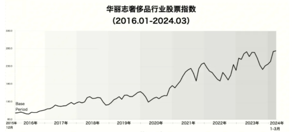 华丽志奢侈品行业股票指数显示,2016年以来指数持续处于震荡上行走势,2024年3月指数一度达到273.7点,较2023年10月的220.9点上涨23.9%。