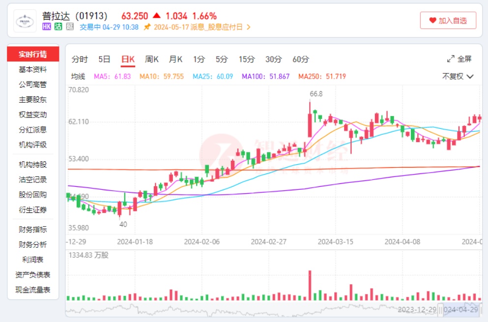 智通财经APP注意到,奢侈品行业受到投资者青睐的同时,部分个股也帮助投资者获得了“超额收益”。其中,普拉达(01913)的股价在2024年3月达到创近10年新高的65.66港元(前复权),年内最大涨幅超过50%,较2020年低点15.4港元,最大涨幅超过300%。