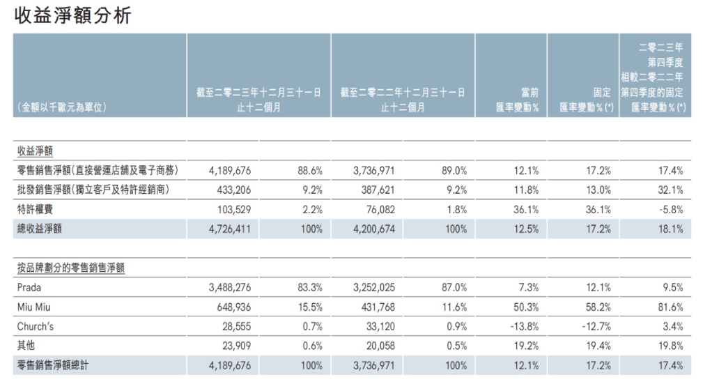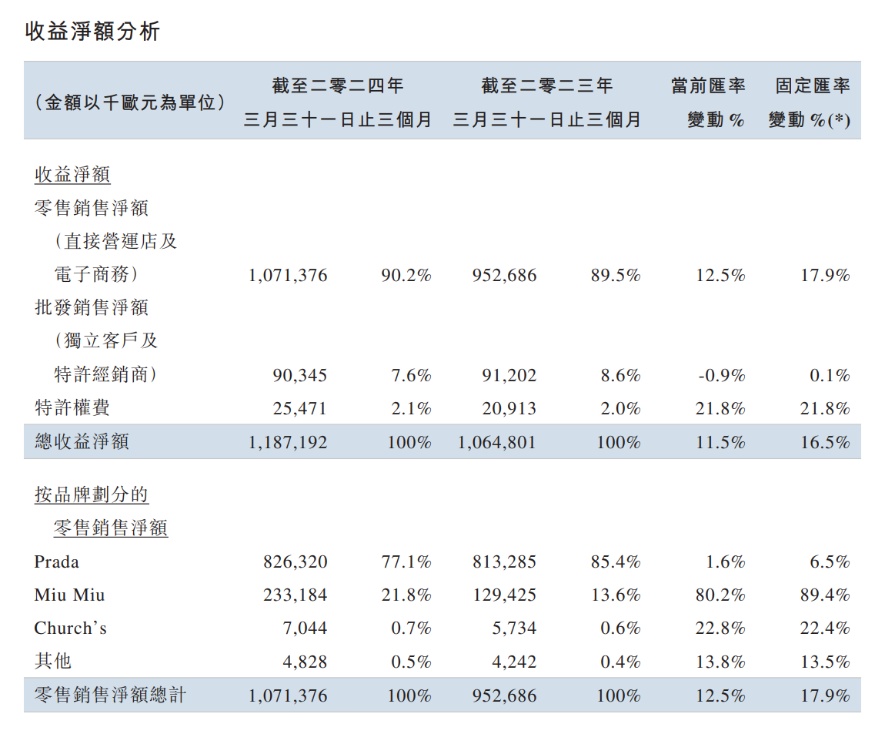 财报显示,2021年、2022年和2023年,普拉达营收分别达到33.65亿欧元、41.25亿欧元和47.26亿欧元,净利润分别为2.94亿欧元、4.65亿欧元和6.71亿欧元。2021年至2023年的营收年复合增长率达到18.5%;净利润年复合增长率达到51.1%。2024年一季度,普拉达实现收入11.87亿欧元,按固定汇率计,同比增加16%,实现连续13个季度取得零售增长。