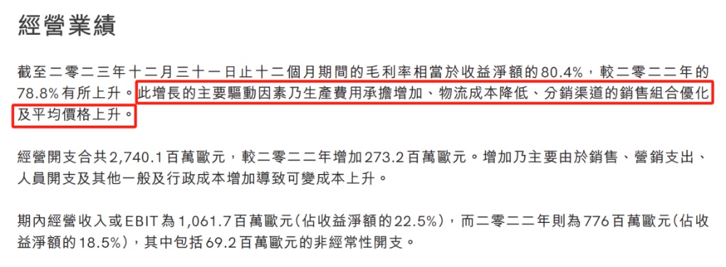 普拉达收入增长的过程中,盈利能力也逐步提升。公司销售毛利率从2020年的71.96%逐年提升至2023年的80.44%,期间升幅达8.48个百分点。普拉达