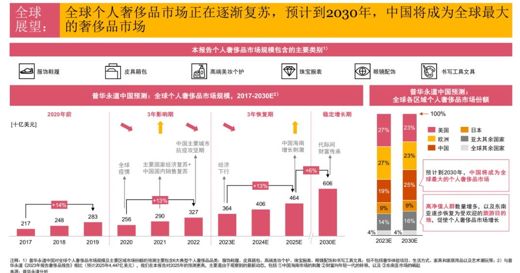 随着高净值人群增长,全球个人奢侈品市场正在逐步复苏,预计到2030年全球个人奢侈品市场规模将达到6060亿美元。其中,中国有望在2030年成为全球最大的个人奢侈品市场,市场份额预计达到25%。