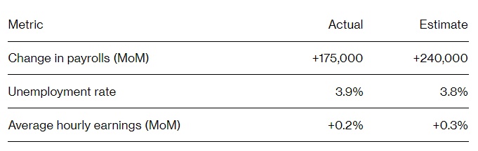 美国劳工统计局周五公布的报告显示,上月非农就业人数增加17.5万人,为六个月来的最小增幅,低于市场预期的24万人。失业率上升至3.9%,高于预期的3.8%。