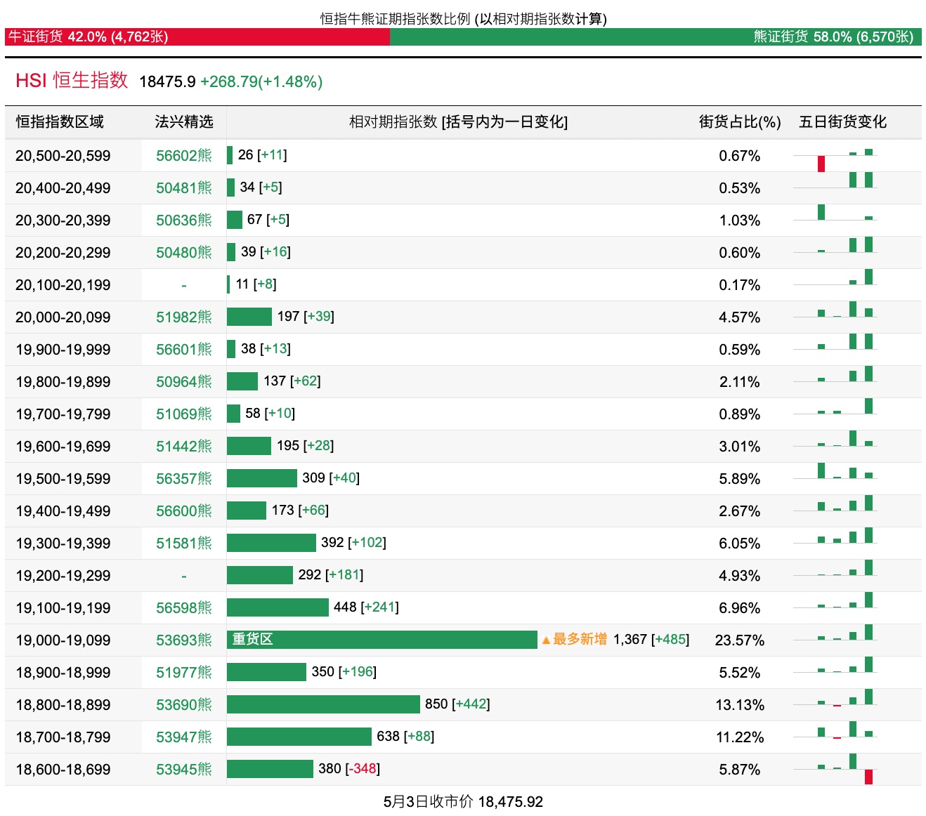 法兴恒指牛熊证街货分布图中的数据显示,熊证街货最多新增和重货区均在19000-19099区间,该区间最新熊证数量为1367张,较上一交易日增加485张。