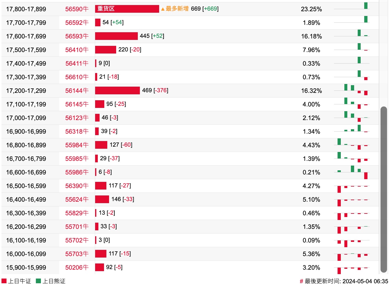 牛证街货最多新增和重货区均在17800-17899区间,该区间最新熊证数量为669张,较上一交易日增加669张。