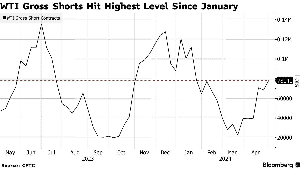 智通财经APP获悉,随着WTI原油价格跌至7周以来的最低水平,对冲基金大举做空WTI原油。美国商品期货数据委员会(CFTC)的数据显示,在截至4月30日的一周内,对冲基金的WTI原油净多头头寸减少了6957手,至172689手,为连续第三周下降。与此同时,对冲基金的WTI空头头寸增加了9705手,至78141手,为1月以来最高水平。