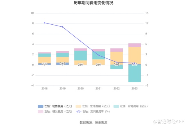 而在业绩下滑的同时,公司各项费用却大幅增长。2023年,销售费用同比增长152.62%,管理费用同比增长33.57%,研发费用同比增长6.47%,财务费用由去年同期的7872.84万元变为3.31亿元,期间费用率为0.53%,较上年同期下降0.25个百分点。