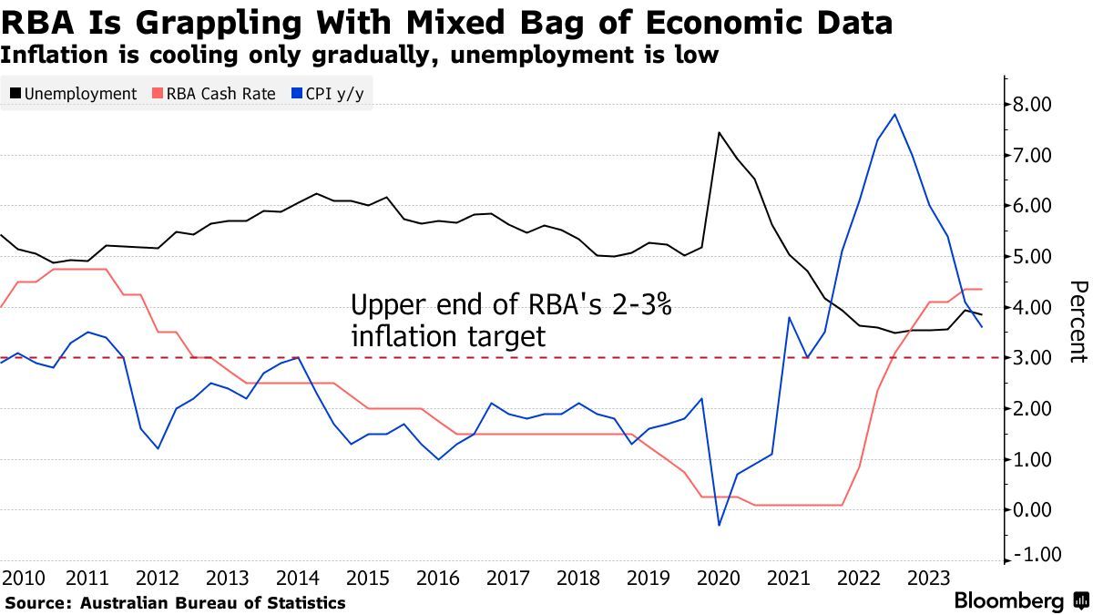 智通财经APP获悉,澳洲联储将于周二公布利率决议。澳洲联储可能会将基准利率维持在12年高位,并在今年大部分时间里维持这一利率水平,以抑制就业市场意外吃紧所支撑的通胀压力。