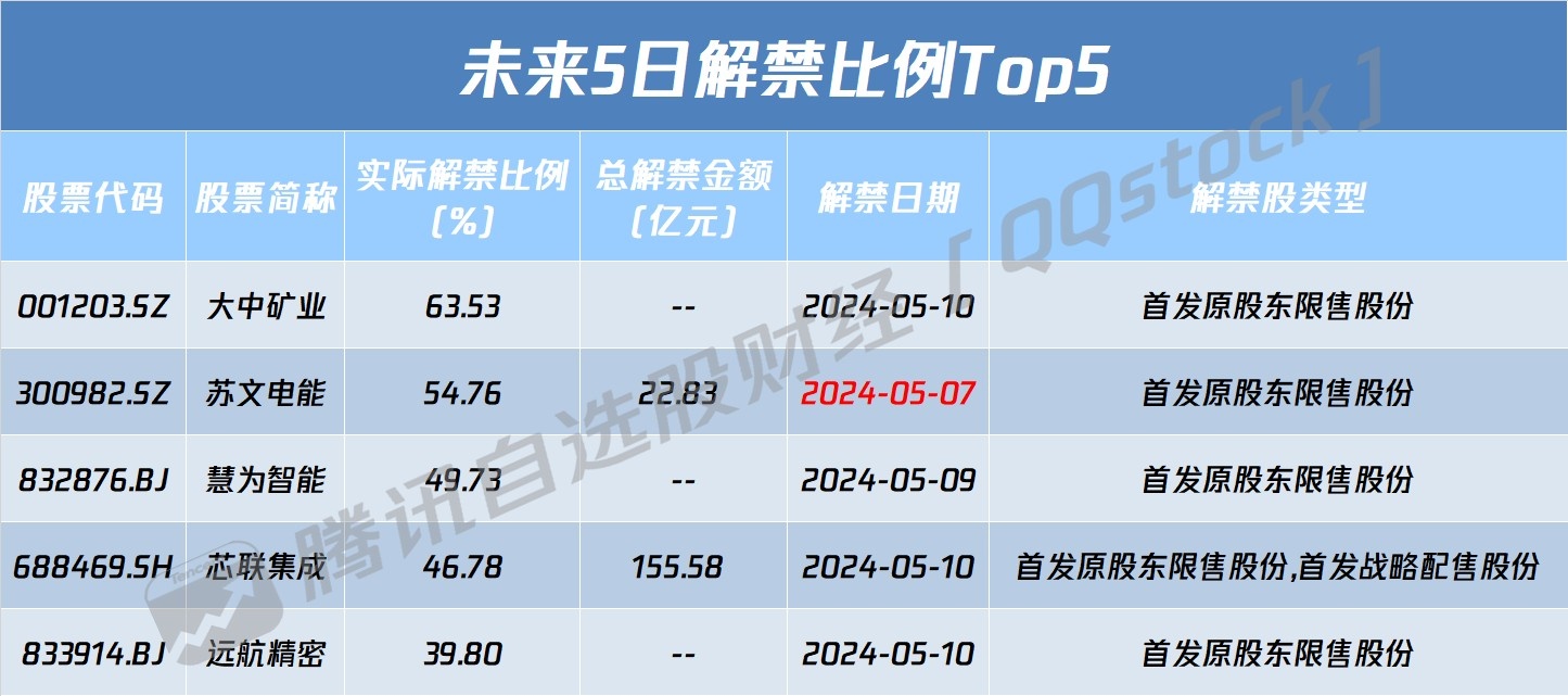 从解禁比例来看,未来5日大中矿业解禁比例居首,其次为苏文电能、慧为智能等股。