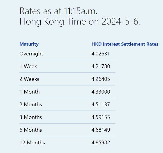 智通财经APP获悉,市场憧憬美联储或提早降息,5月6日,港元拆息全线下跌,隔夜拆息回落近40基点至4.02631%,险守4%,与楼按相关的一个月拆息亦结束六连升,跌至4.33%。