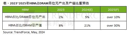吴雅婷指出,受惠于HBM销售单价较传统型DRAM(Conventional DRAM)高出数倍,相较DDR5价差大约五倍,加上AI芯片相关产品迭代也促使HBM单机搭载容量扩大,推动2023~2025年间HBM之于DRAM产能及产值占比均大幅向上。产能方面,2023~2024年HBM占DRAM总产能分别是2%及5%,至2025年占比预估将超过10%。