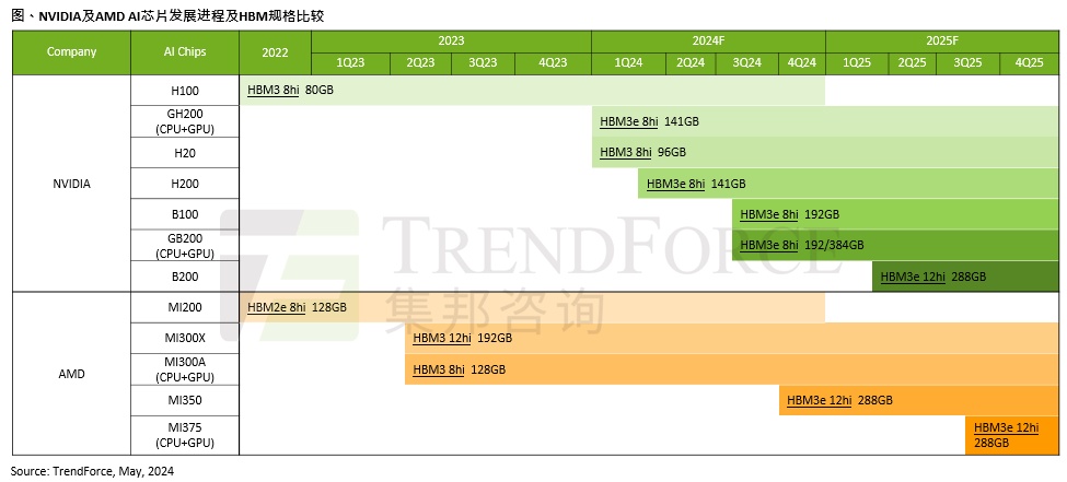 展望2025年,由主要AI解决方案供应商的角度来看,HBM规格需求大幅转向HBM3e,且将会有更多12hi的产品出现,带动单芯片搭载HBM的容量提升。根据TrendForce集邦咨询预估,2024年的HBM需求位元年成长率近200%,2025年可望将再翻倍。