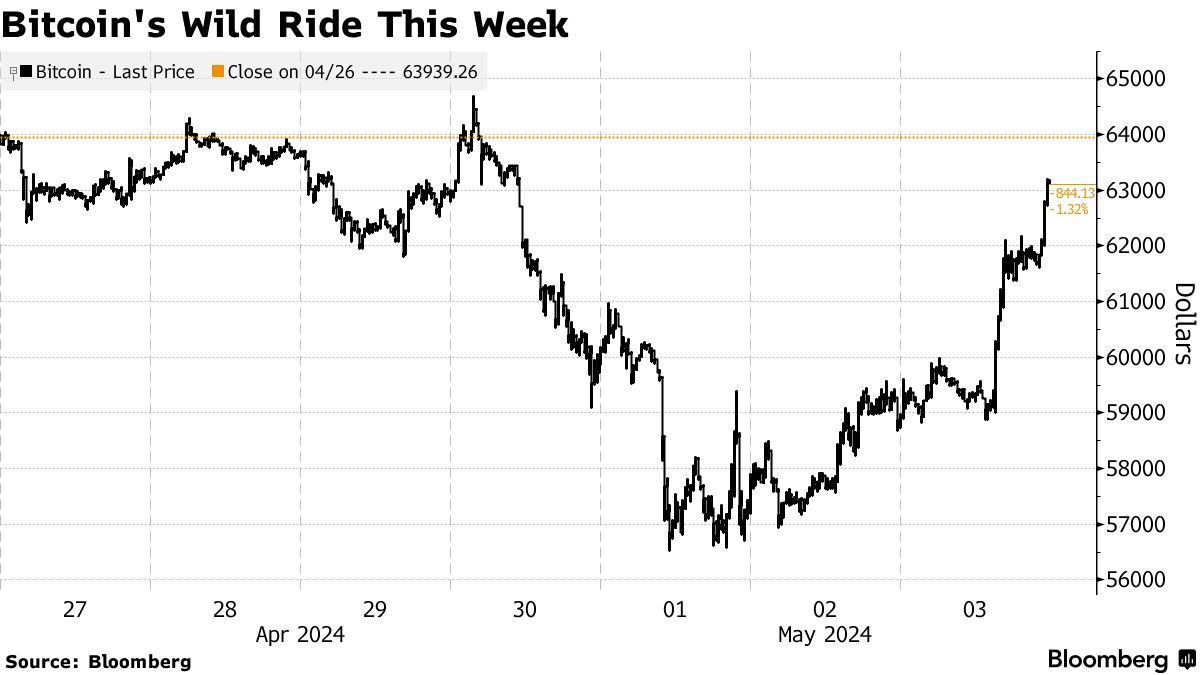数据显示,比特币在5月3日上涨约7%,至至62,937美元,并推动以太币、Solana等小型加密货币甚至狗狗币(Dogecoin)等meme币的价格上涨。而在5月1日,比特币跌至56,527美元,是大约两个月来的最低水平。