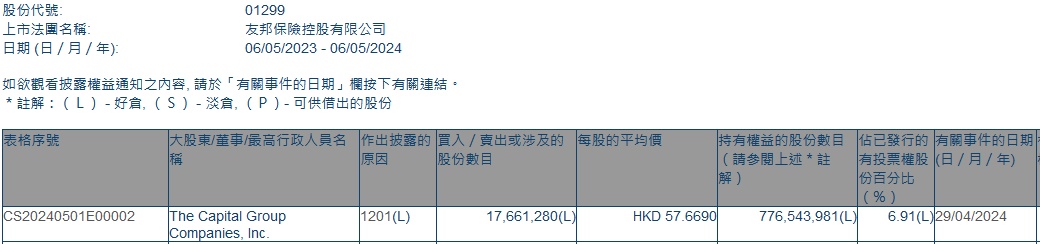 智通财经APP获悉,香港联交所最新资料显示,4月29日,美国资本集团减持友邦保险(01299)1766.128万股,每股作价57.669港元,总金额约为10.19亿港元。减持后最新持股数目约为7.77亿股,最新持股比例为6.91%。