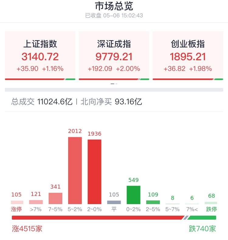5月6日,A股节后迎开门红,成交额连续四个交易日破万亿元。盘面上,市场大消费等核心资产再度回归,白酒、医药、家电等板块领涨,“股王”贵州茅台创年内新高;合成生物题材延续火热,化工链掀涨停潮,高铁、新能源赛道等均有所表现;下跌方面,ST板块上演跌停潮,教育、旅游等板块跌幅居前。