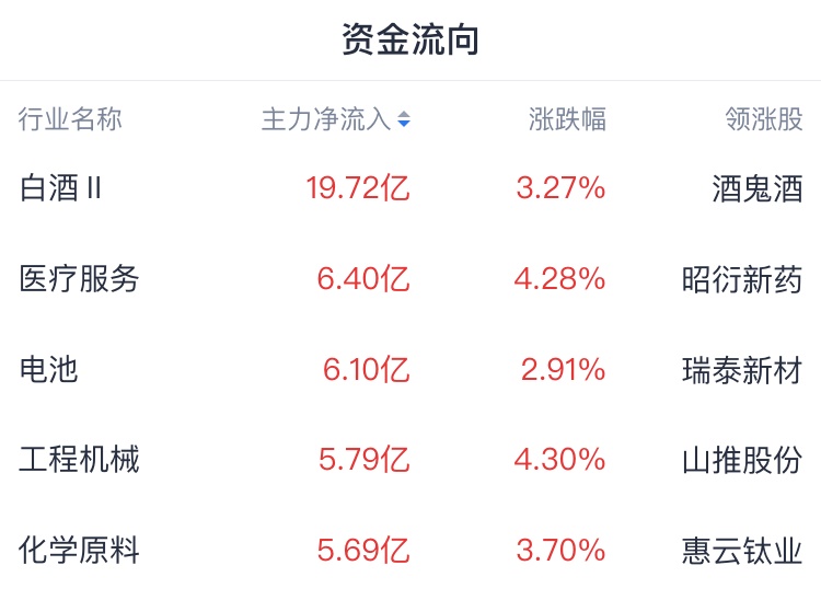 主力资金方面,资金青睐白酒、医疗服务、电池、工程机械等行业;资金出逃通信设备、乘用车、房地产开发、证券等行业。