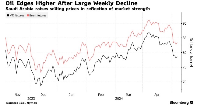 布伦特原油上周下跌逾 7%,创 2 月份以来最大跌幅,随后攀升至每桶 84 美元。WTI原油价格接近 79 美元。沙特阿美公司将其旗舰阿拉伯轻质原油 6 月份的官方售价提高了 90 美分,至每桶 2.90 美元,较基准价格高出 90 美分。相比之下,调查预测增幅为 60 美分。