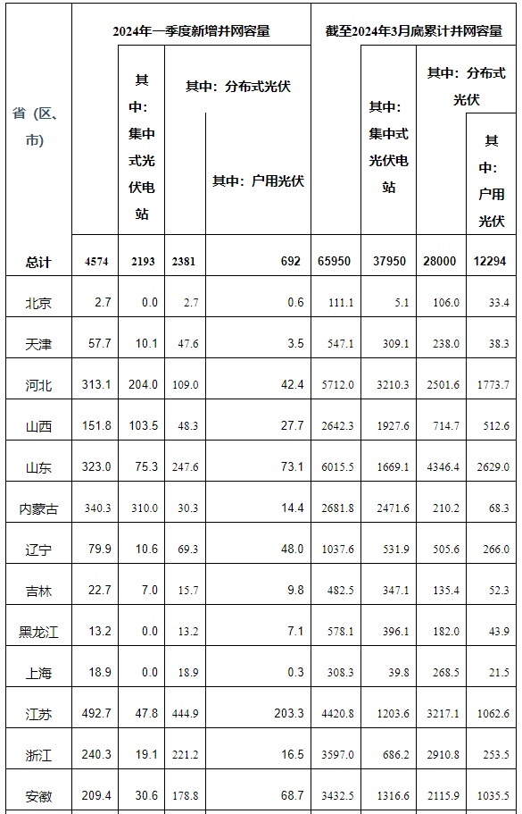 智通财经APP获悉,5月6日,国家能源局公布2024年一季度光伏发电建设情况。2024年一季度光伏发电新增并网容量4574万千瓦,截至2024年3月底累计并网光伏发电容量65950万千瓦。