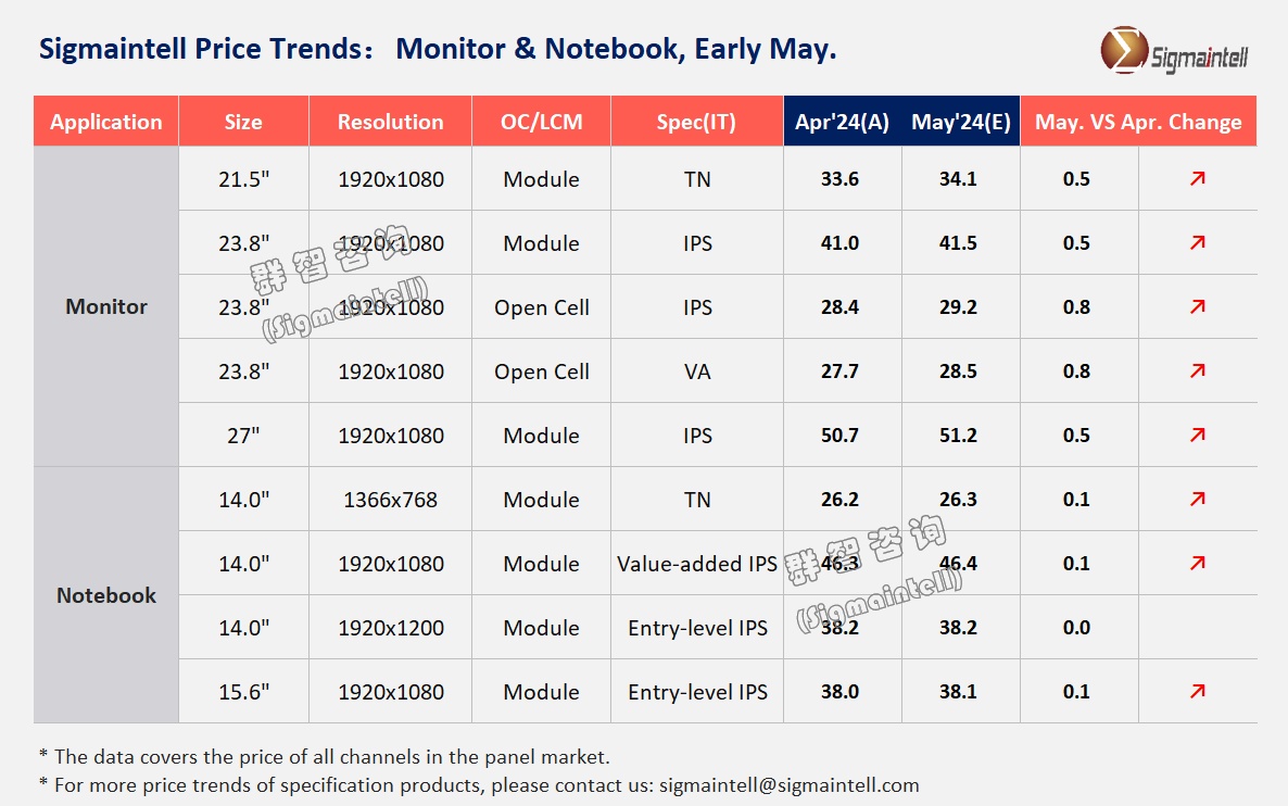 23.8"FHD,5月 Open cell面板价格预计上涨0.8$, LCM价格预计上涨0.5$;