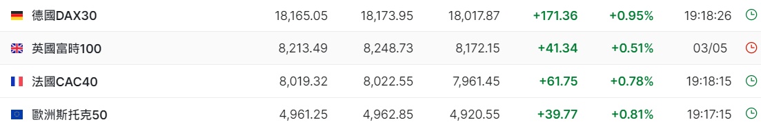 2. 截至发稿,德国DAX指数涨0.95%,英国富时100指数涨0.51%,法国CAC40指数涨0.78%,欧洲斯托克50指数涨0.81%。