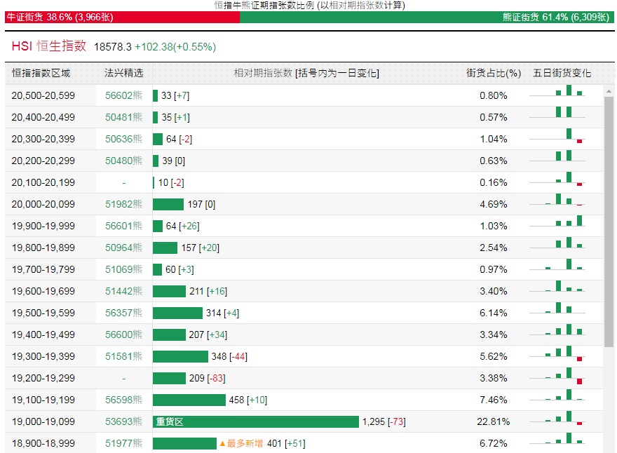 法兴恒指牛熊证街货分布图中的数据显示,熊证街货重货区在19000-19099区间,该区间最新熊证数量为1295张,较上一交易日减少73张;最多新增在18900-18999区间,该区间最新熊证数量为401张,较上一交易日增加51张。