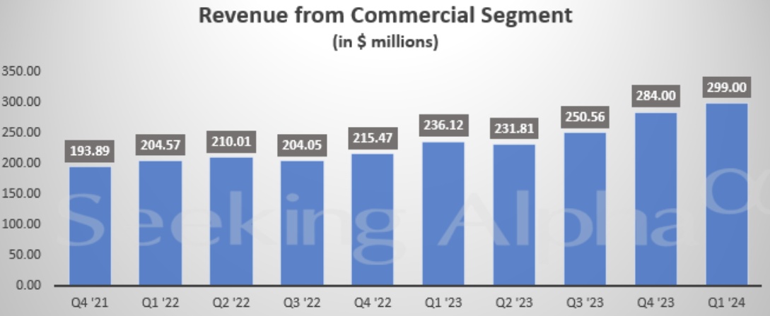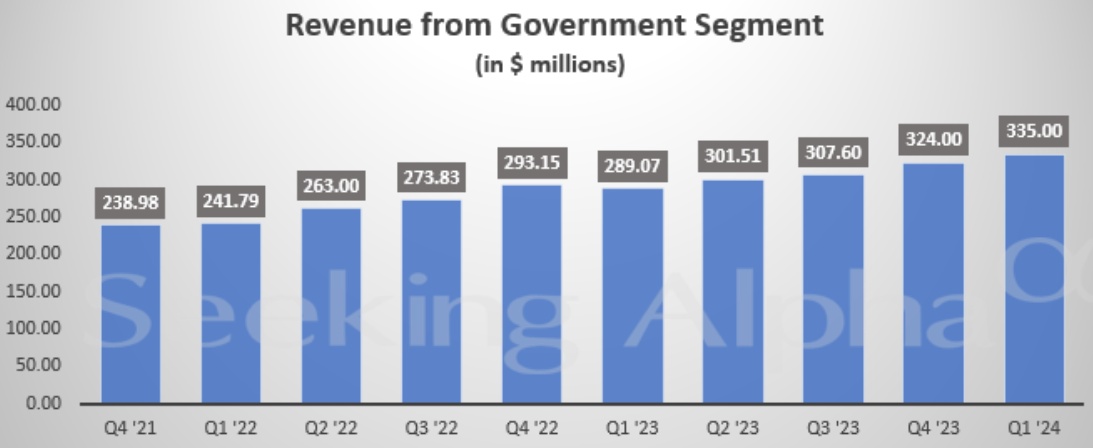 Palantir公布,第一季度政府收入为3.35亿美元,同比增长16%,商业收入为2.99亿美元,同比增长27%。其中,美国商业收入同比增长40%,环比增长14%,达到1.5亿美元;美国政府收入也占了很大一部分,同比增长12%,至2.57亿美元。