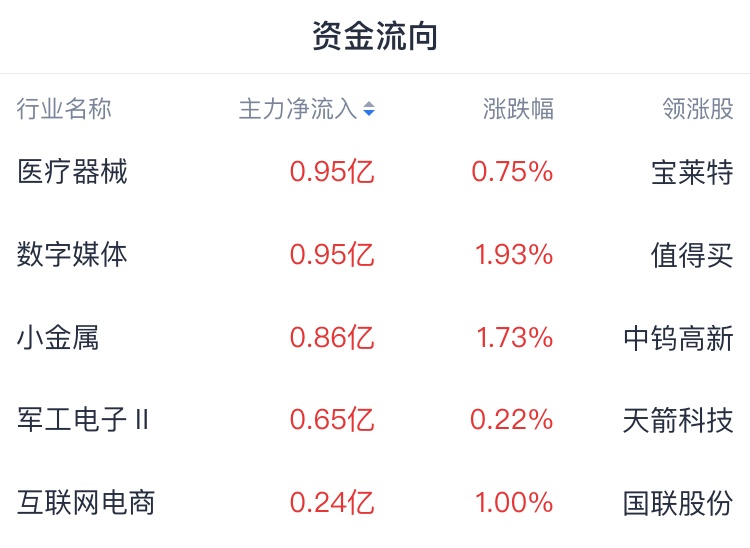 主力资金方面,资金青睐医疗器械、数字媒体等行业;资金出逃乘用车、化学制药、汽车零部件等行业。