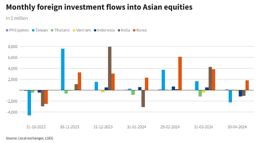 来自中国台湾、印度、印度尼西亚、越南、菲律宾、泰国和韩国证券交易所的数据显示,外国投资者上月净抛售了25.4亿美元的地区股票,这是自2023年11月以来最大的月度净流出。