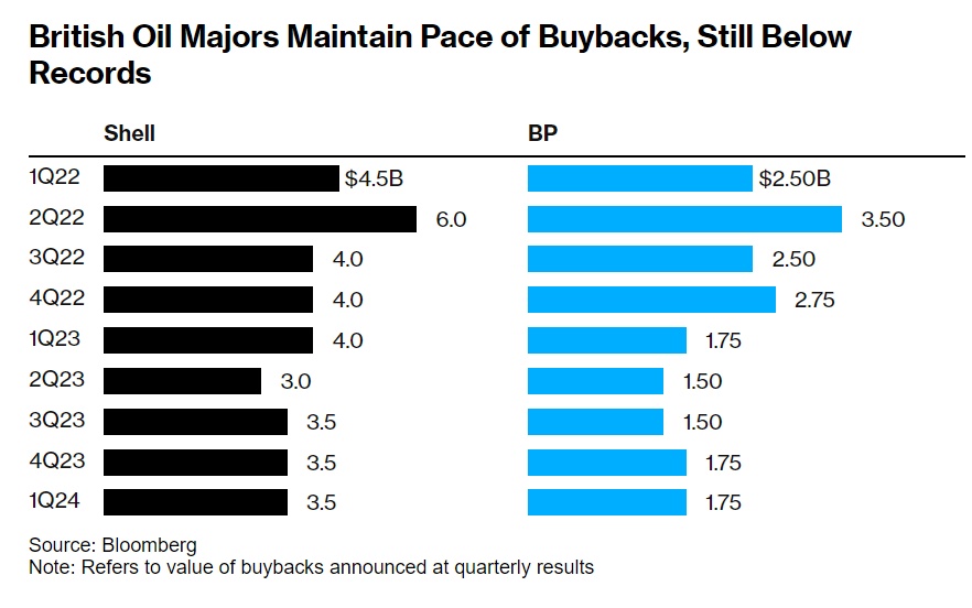 业绩数据方面,欧洲的这些能源巨头们业绩在2023年年末以来国际原油价格上涨浪潮的助力下也未能实现强劲的净利润,并且利润在此后很长一段时间内很可能因油价下滑以及全球加速转向可再生能源而停止,但是他们在2024年仍维持股票回购步伐,尽可能地利用手里的现金流来回馈股东。