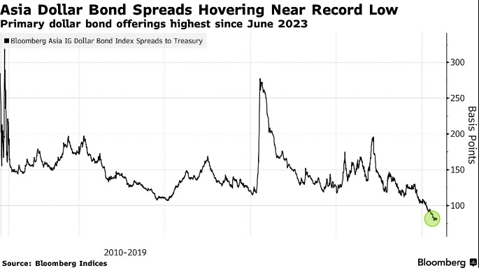 近期,亚洲信贷市场的借贷成本降至历史低点。根据Bloomberg指数显示,投资者对亚洲地区发行人投资级美元债券的额外收益率要求已降至约81个基点,接近上周创下的历史最低点80个基点。