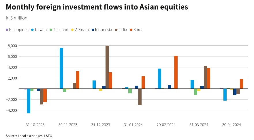 来自中国台湾、印度、印度尼西亚、越南、菲律宾、泰国和韩国证券交易所的数据显示,外国投资者上月净抛售了25.4亿美元的地区股票,这是自2023年11月以来最大的月度净流出。不过,与第一季度约185.7亿美元的外资净流入相比,这些资金流出显得微不足道。