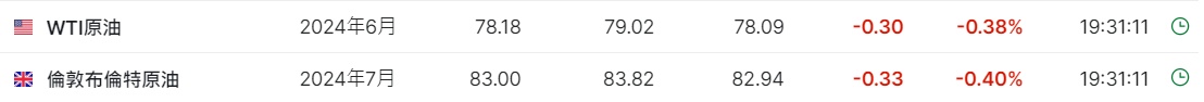 3. 截至发稿,WTI原油跌0.38%,报78.18美元/桶。布伦特原油跌0.40%,报83.00美元/桶。