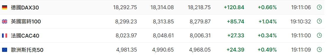 2. 截至发稿,德国DAX指数涨0.66%,英国富时100指数涨1.04%,法国CAC40指数涨0.34%,欧洲斯托克50指数涨0.49%。