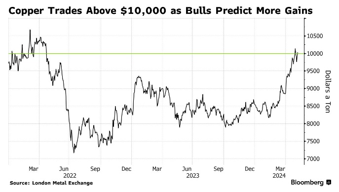 2024年迄今,铜价累计上涨了16%,原因是全球工厂活动出现复苏迹象,以及供应紧张的迹象——尤其是运往冶炼厂的原材料。