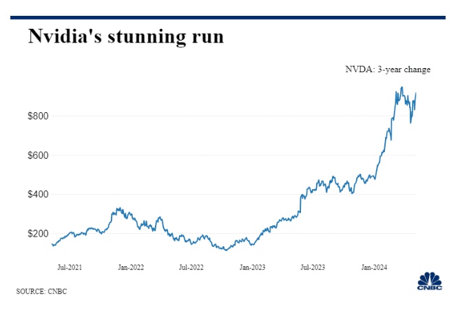 由于人工智能热潮的推动,英伟达去年成为表现最好的股票之一,涨幅高达238%。2024年迄今,该股股价又上涨了66%。