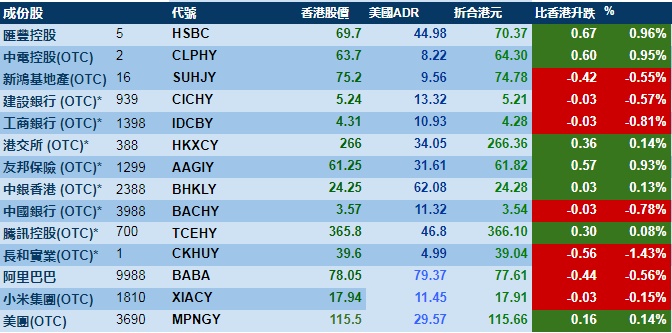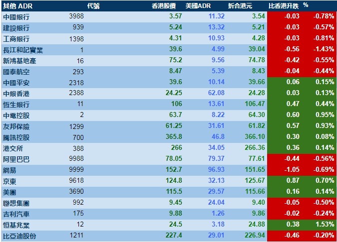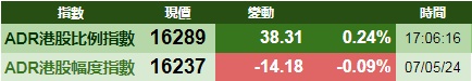 智通财经APP获悉,周二美股三大指数涨跌不一,港股ADR指数上涨,按比例计算,收报16289点,较香港收市上涨38.31点或0.24%。
