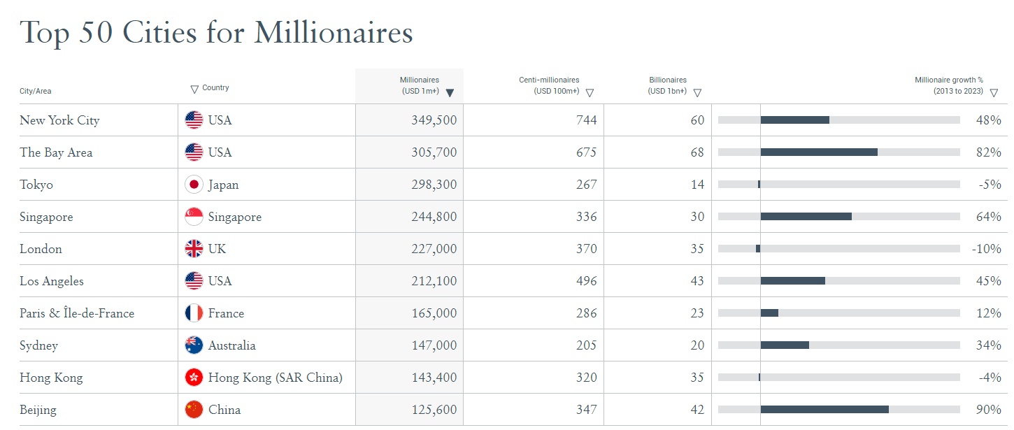 报告显示,纽约是全球拥有最多百万富豪的城市,达到近35万人,2013~2023年的十年间增加了48%。其次是旧金山湾区,有30.57万名百万富豪,十年间增加了82%。日本东京第三,有约29.83万名百万富豪,十年内减少了5%。新加坡位列第4,百万富豪人口达24.48万。