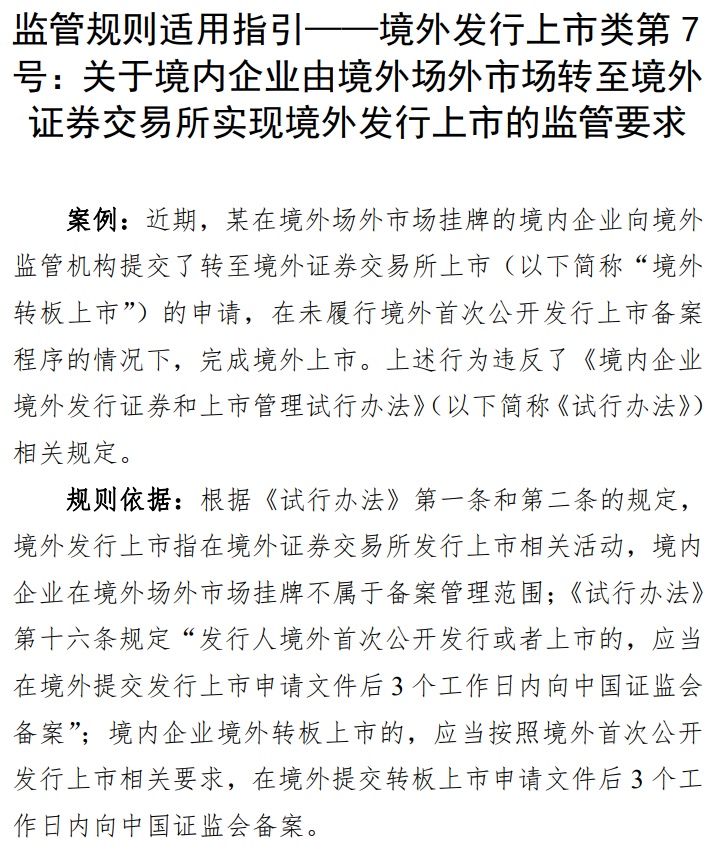 智通财经APP获悉,5月7日,中国证监会网站发布《监管规则适用指引——境外发行上市类第7号:关于境内企业由境外场外市场转至境外证券交易所实现境外发行上市的监管要求》,并通报了一起未履行上市备案程序就完成境外上市的案例。