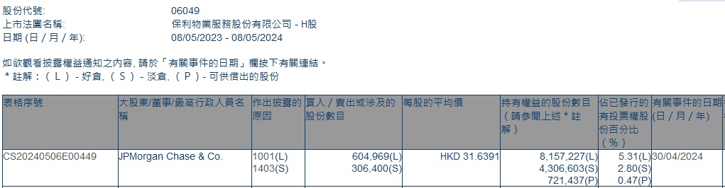 智通财经APP获悉,香港联交所最新资料显示,4月30日,小摩增持保利物业(06049)60.4969万股,每股作价31.6391港元,总金额约为1914.07万港元。增持后最新持股数目为815.72万股,最新持股比例为5.31%。