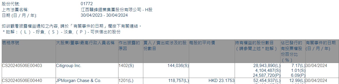 智通财经APP获悉,香港联交所最新资料显示,4月30日,小摩减持赣锋锂业(01772)11.8757万股,平均每股作价23.1753港元,总金额约为275.22万港元。减持后最新持股数目为5245.4937万股,最新持股比例为12.99%。