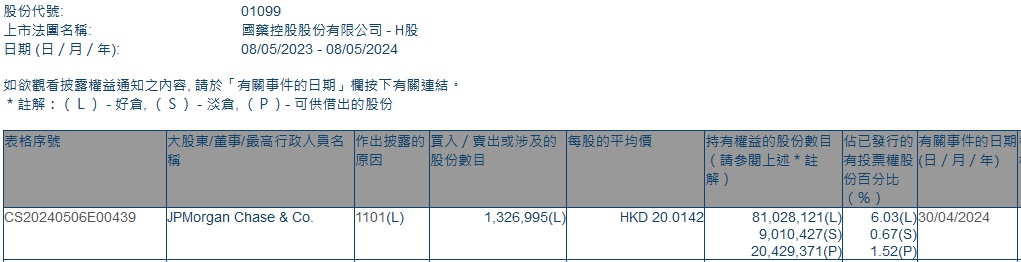 智通财经APP获悉,香港联交所最新资料显示,4月30日,小摩增持国药控股(01099)132.6995万股,每股作价20.0142港元,总金额约为2655.87万港元。增持后最新持股数目约为8102.81万股,最新持股比例为6.03%。