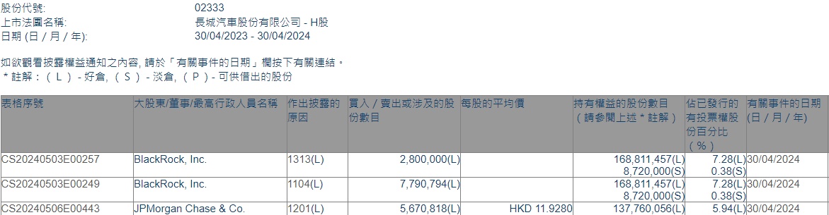 智通财经APP获悉,香港联交所最新资料显示,4月30日,小摩减持长城汽车(02333)567.0818万股,平均每股作价11.928港元,总金额约为6764.15万港元。减持后最新持股数目约为1.38亿股,最新持股比例为5.94%。
