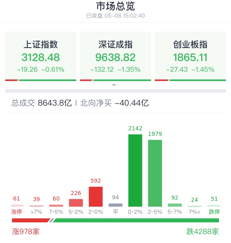 5月8日,A股缩量调整,成交额缩量超千亿元。盘面上,多数题材概念下跌,地产股领跌,AI应用方向、低空经济等板块纷纷调整;上涨方面,干细胞、细胞免疫治疗概念股发酵,带动医药股集体走强,合成生物概念再度大涨,养殖板块午后持续拉升,煤炭、银行、电力等高股息活跃。