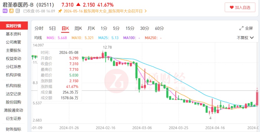 但在5月8日,君圣泰医药尾盘发力,股价涨幅瞬间拉至最高49.42%,股价最高达到7.71港元,最终报收7.31港元,股价回到今年3月中旬水平。但从基本面角度来看,其后续股价能否彻底走出低谷期仍是个未知数。